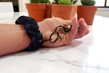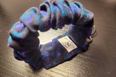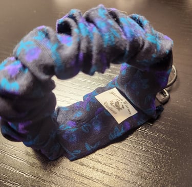 Beautiful soft cotton fabric, black with small purple flowers and greenish/blue leaves; and a 1" wide black metal clip/ring.