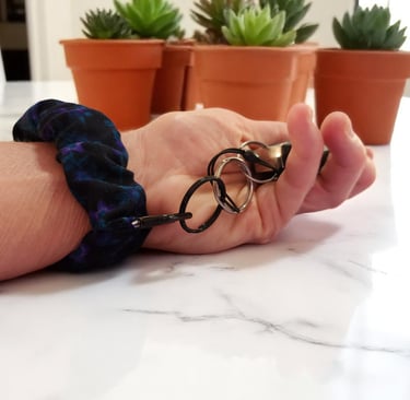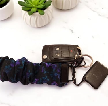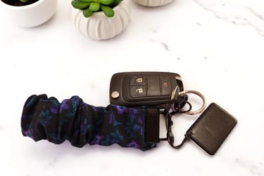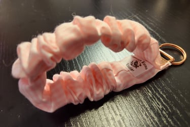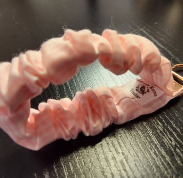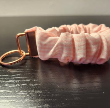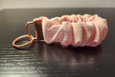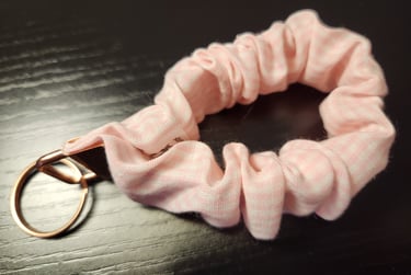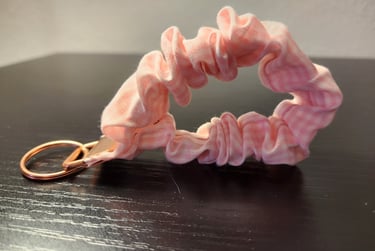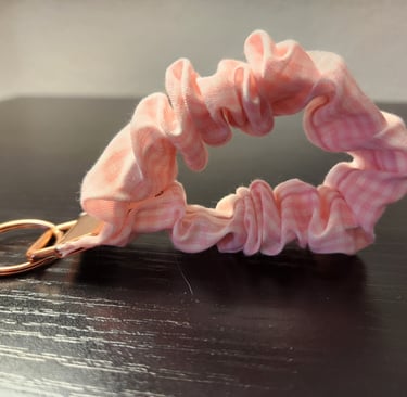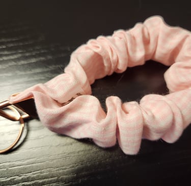 Scrunchie wristlet keychain, pink and white checkered pattern.